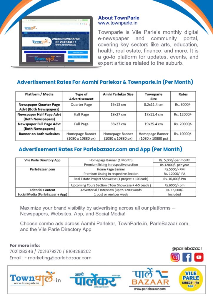 Parle Bazaar.com is a joint venture between ‘Aamhi Parlekar’ 33 years old suburban news magazine and ‘Townparle.in’ digital e-paper of VileParle.
