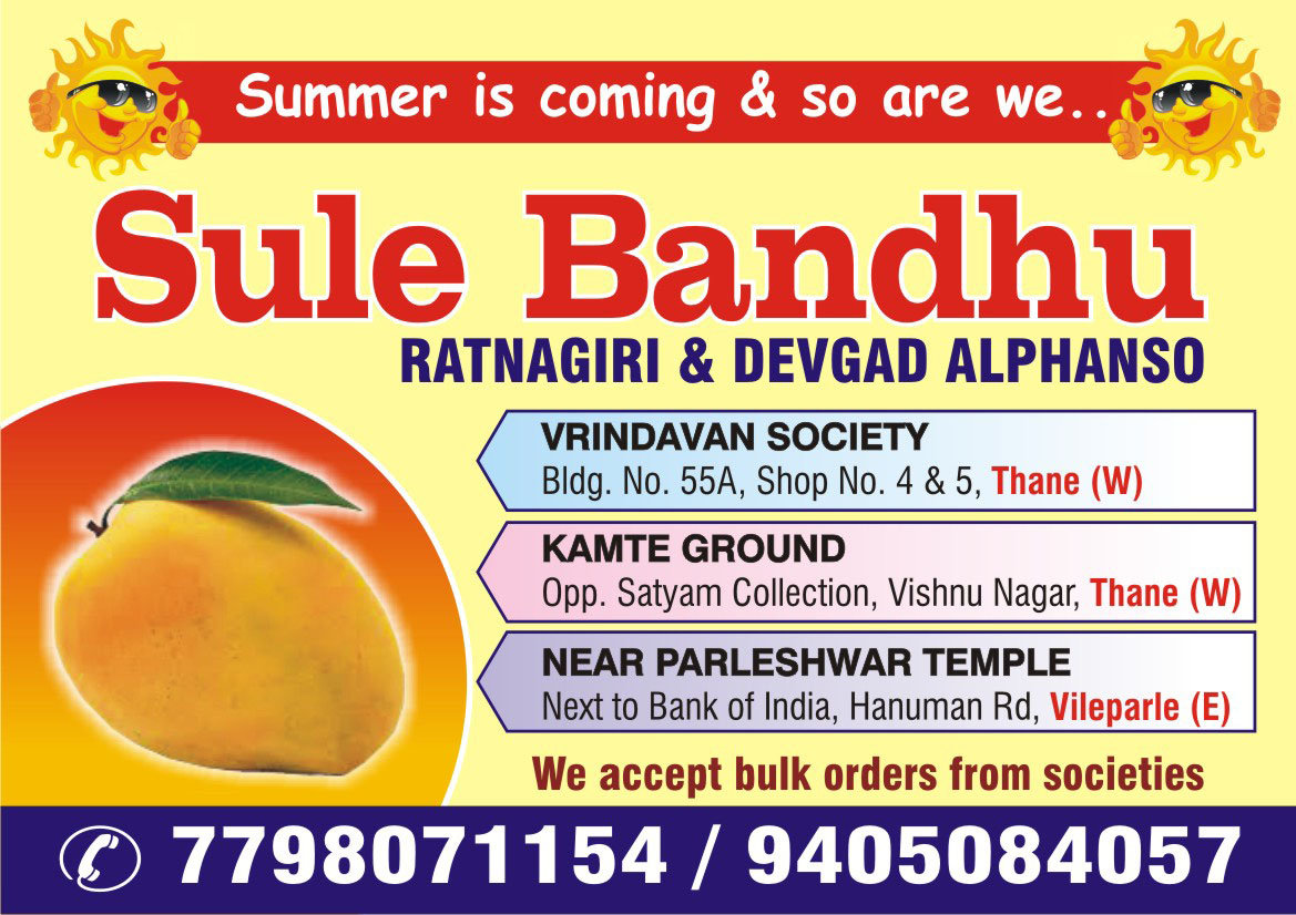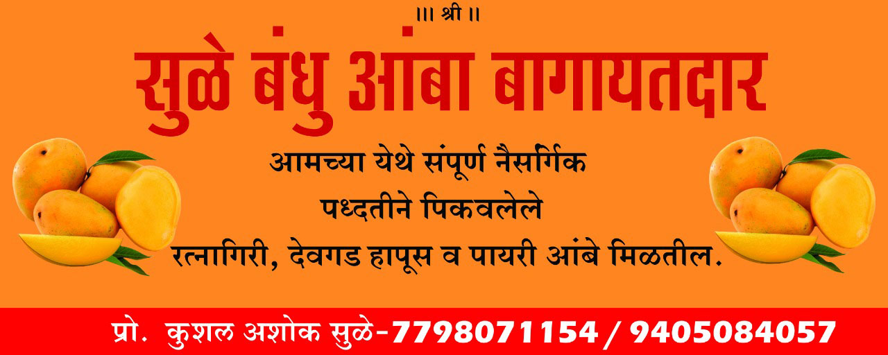 रत्नागिरी आणि सिंधुदुर्गची खास ओळख असलेला हापूस आणि पायरी आंबा आपल्या चवीसाठी आणत आहोत.मी कुशल सुळे मंडणगड,रत्नागिरी येथील रहिवासी असून 2011 पासून आंबा उत्पादन आणि विक्री व्यवसाय ठाणे येथे करत आहे.विलेपार्लेकरांसाठी यावर्षीपासून ही लाल मातीत पिकलेल्या आंब्याचा गोडवा आणत आहोत.